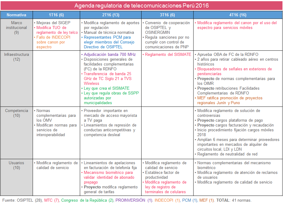 ¿Cuál fue la agenda regulatoria de telecomunicaciones Perú 2016?
