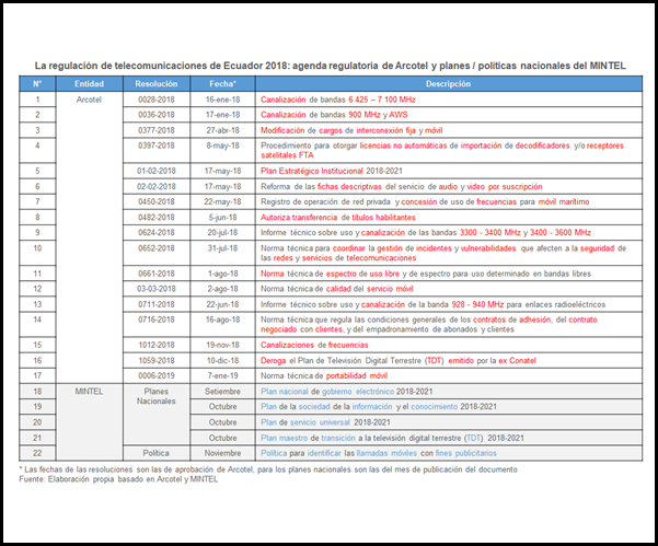 En enero del 2018, la Agencia de Regulación y Control de las Telecomunicaciones (Arcotel) publicó su agenda regulatoria para dicho año, la cual incluyó 27 proyectos normativos. La siguiente lista muestra los 27 proyectos de la agenda regulatoria 2018: Reglamento de mercados Normativa de contabilidad regulatoria Actualización de canalizaciones Canalización [...]